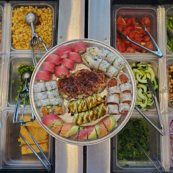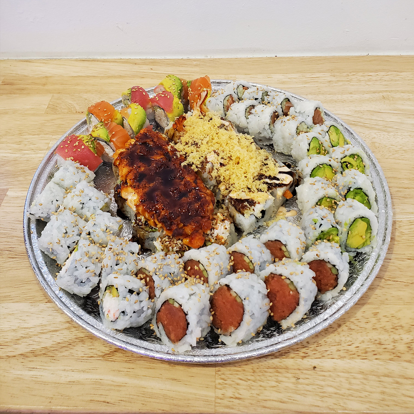 Hawaiian Salmon, Hawaiian Tuna, Spicy Tuna, Shrimp, Crabmeat, Avocado, Spicy Mayo, Eel Sauce, Sesame Oil